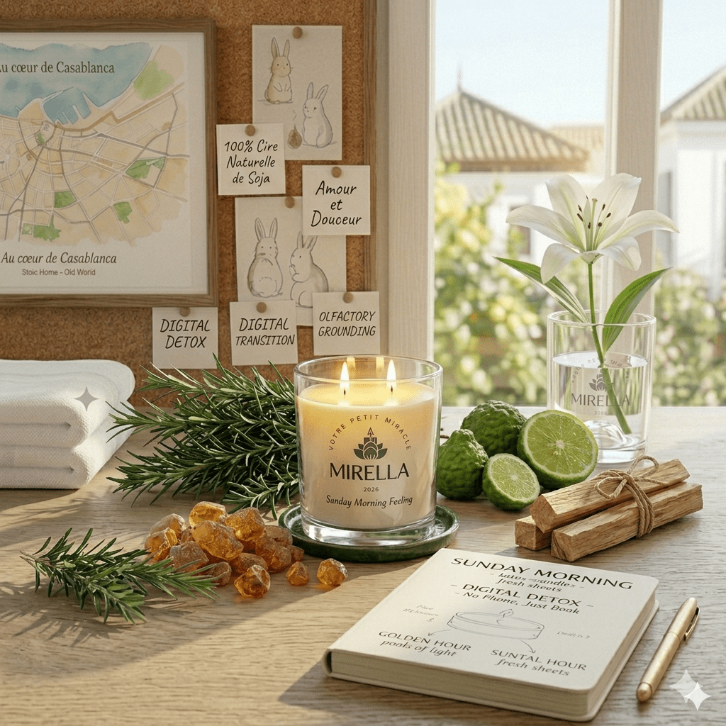 Collection complète Mirella avec bougie en cire naturelle et ingrédients botaniques, le guide visuel ultime pour how to create a relaxing home atmosphere (comment créer une atmosphère de maison relaxante) et construire votre sanctuaire de productivité.